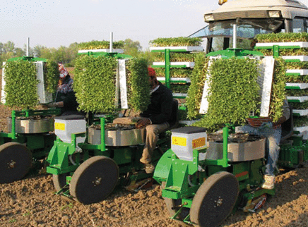 Vegetable transplanting machine with different models to suit all types and sizes of turfs, available in planting units starting from one row and up to 8 rows.